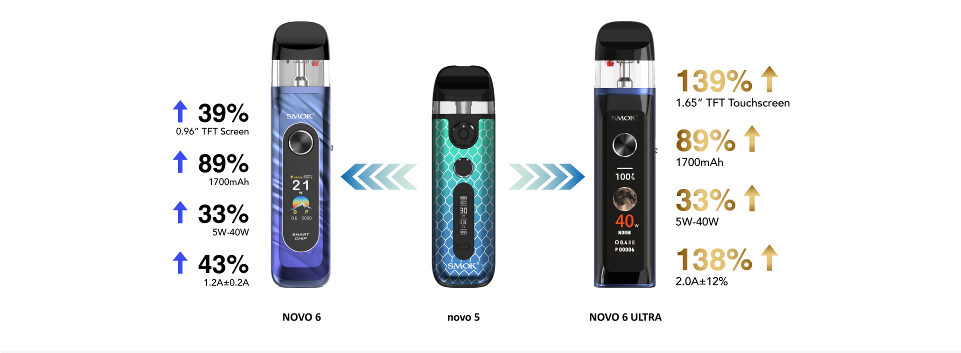 Three things separate the Ultra from the regular Novo 6, and it is worth being precise about what they are because the marketing around SMOK's pod range can make everything sound like a significant leap when the reality is more specific.